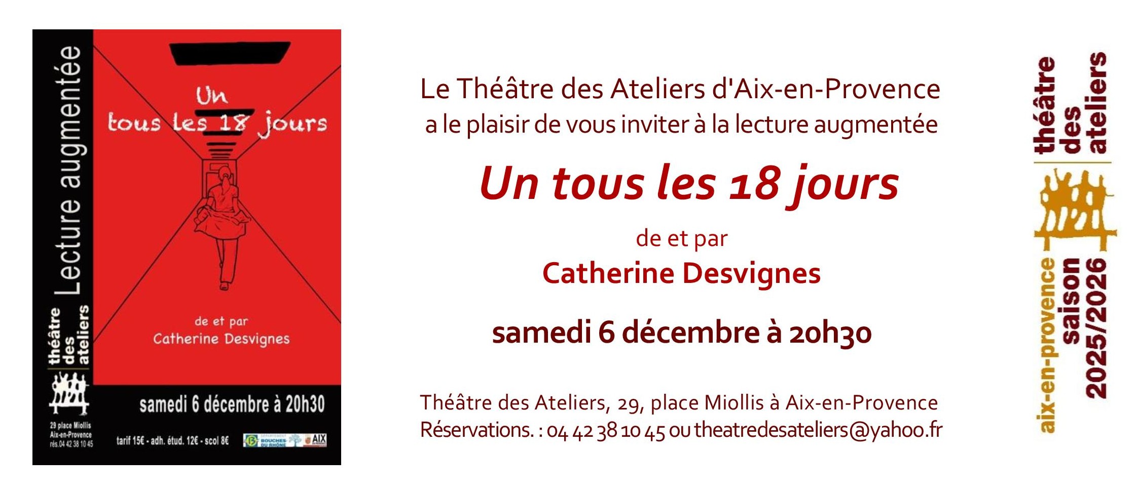 Vous assisterez à une première lecture augmentée d’Un Tous les 18 jours, avec la collaboration d’Alain Simon pour la mise en espace. « Lecture augmentée » signifie qu’il ne s’agira pas d’une simple lecture… Ce sera la naissance publique de ce texte, grand moment pour elle ! Elle a hâte (et peur aussi) de connaître vos réactions et vos critiques.